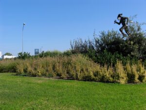 Unica licenza fiorita è stata la realizzazione sui lati opposti alla rotonda di un grande cuscino di Rosa Mutabilis, che da maggio a novembre garantisce fioriture copiose che vanno a sdrammatizzare l’imponenza della scultura.