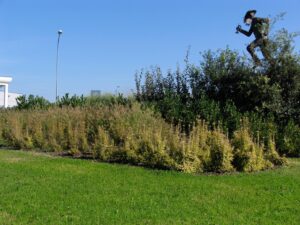 Le abbiamo intervallate ad altri setti di vegetazione fatti da Eleagnus ebbingei, Lonicera bagg’s gold e Quercus ilex perfettamente in linea con le assi stradali che indicavano le direzioni principali.